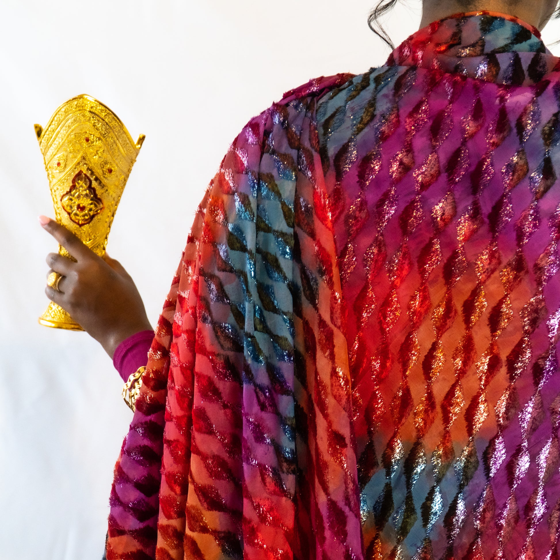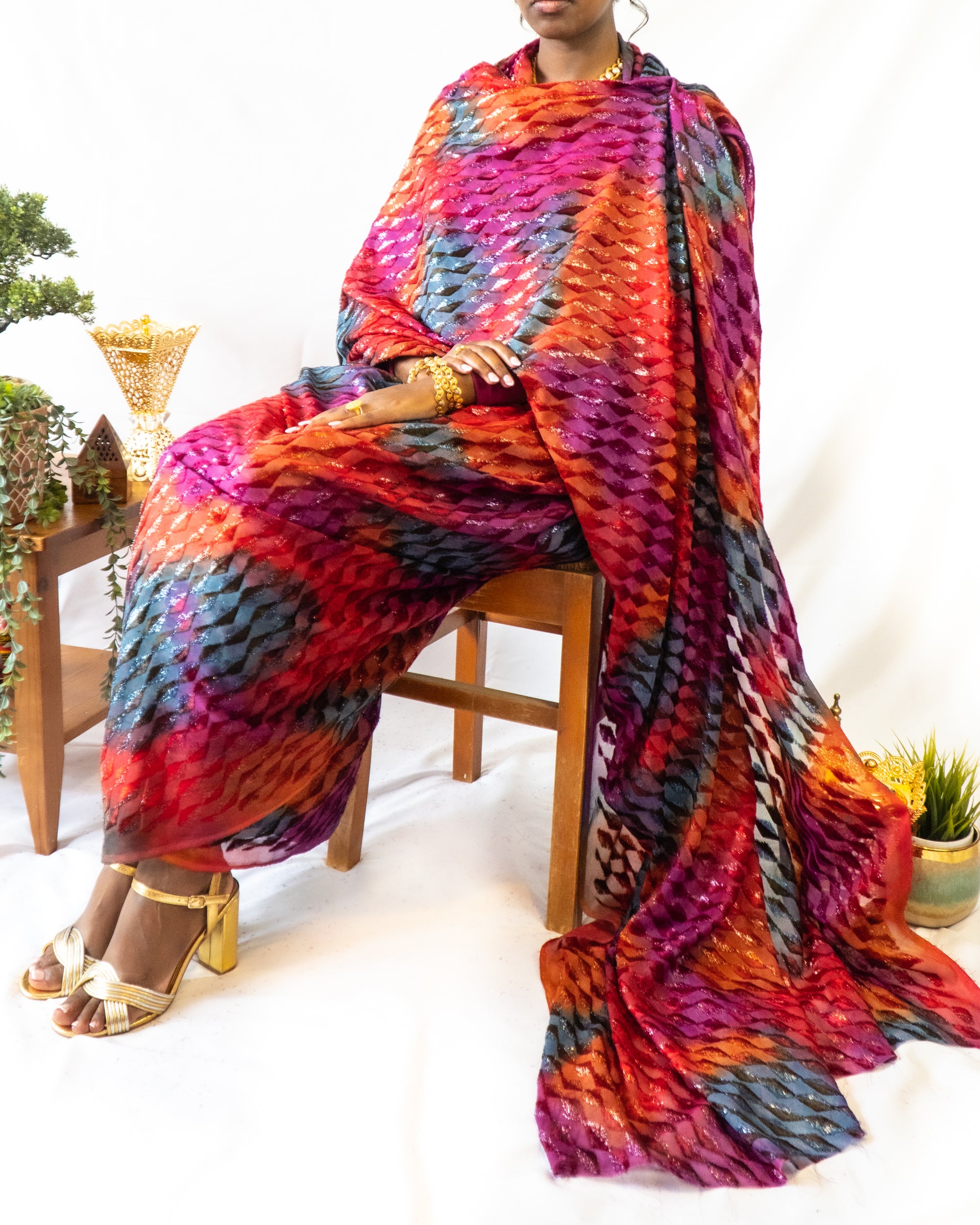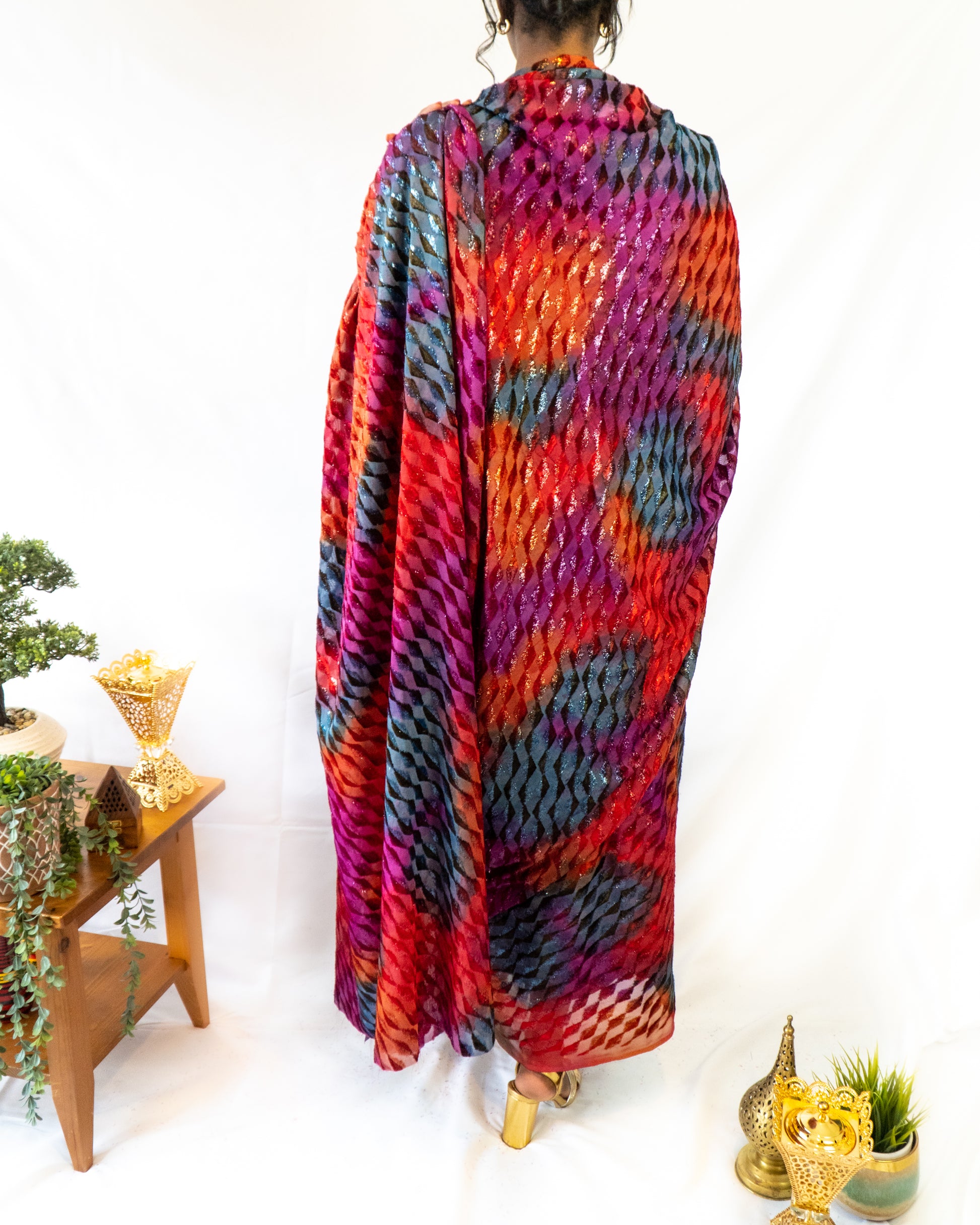 This Toub is vibrant and fierce. Flames of fuchsia, scarlet and electric blue, flickering across a diamond-textured fabric, like the dancing sunset sky.